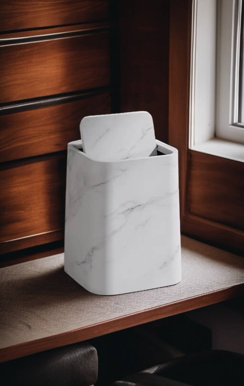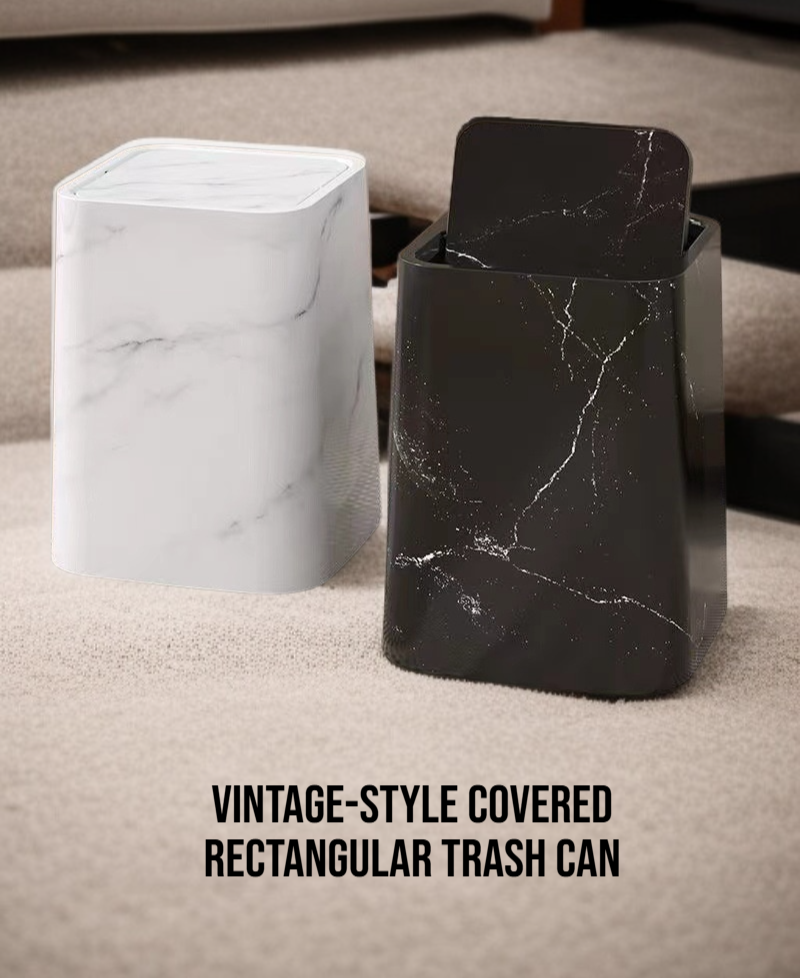 Vintage marble design, large capacity, covered for odor control, durable material, easy to clean, suitable for household use, blends with various interiors.