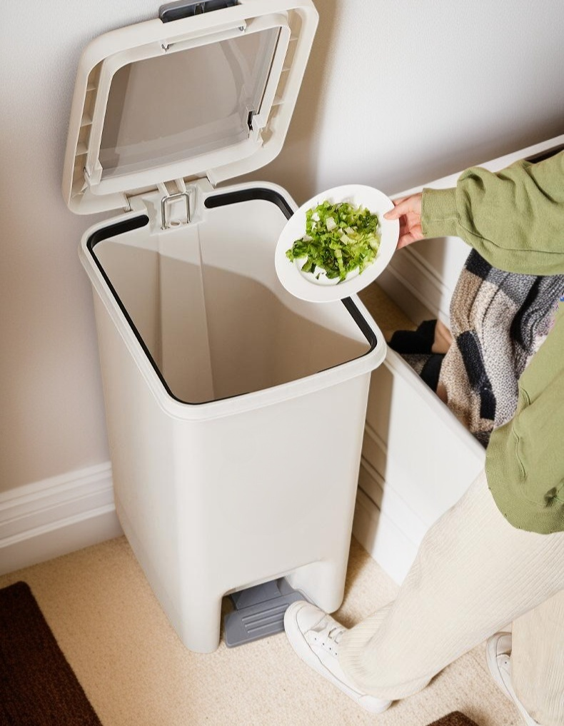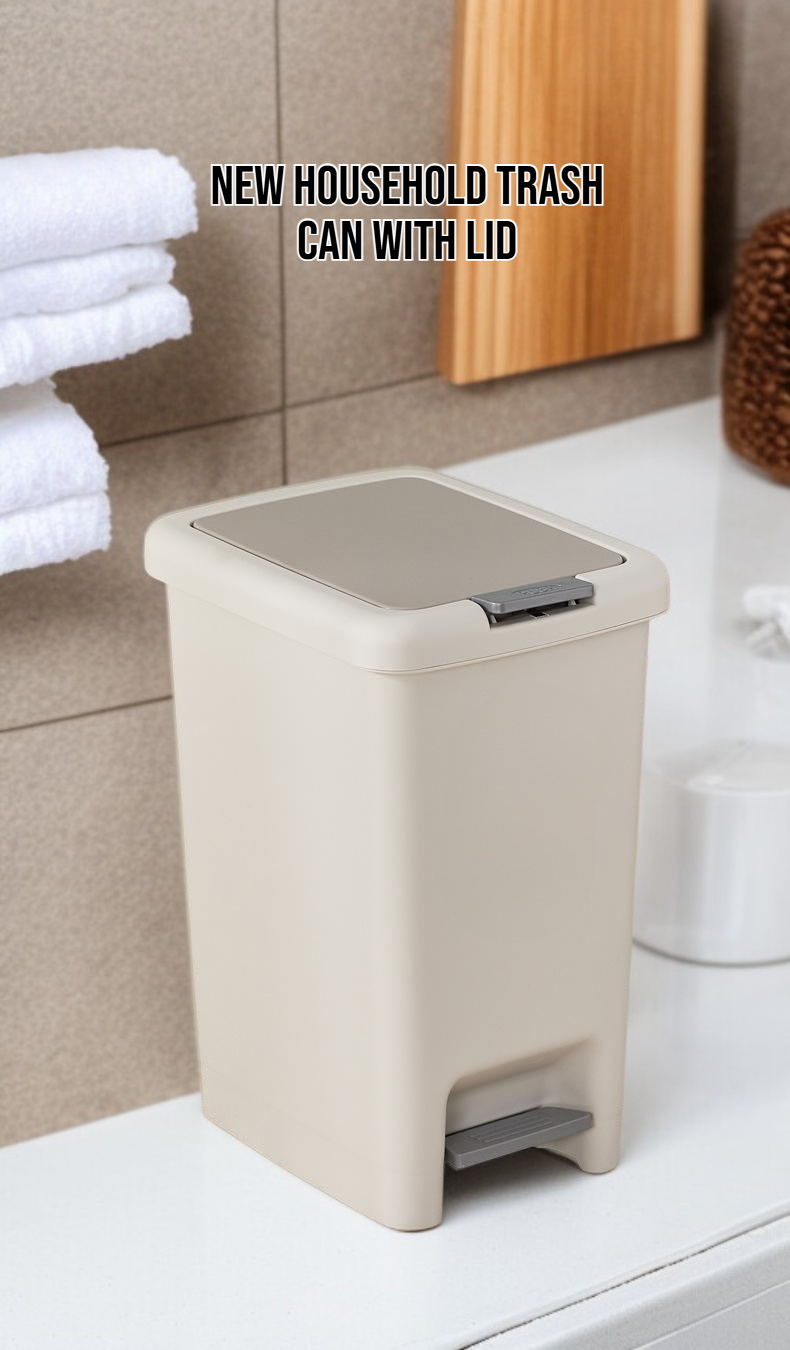 Foot operated garbage bin with lid, hands-free operation, hygienic waste disposal, durable material, modern design, suitable for kitchen or office, easy to clean, space-saving, odor control.